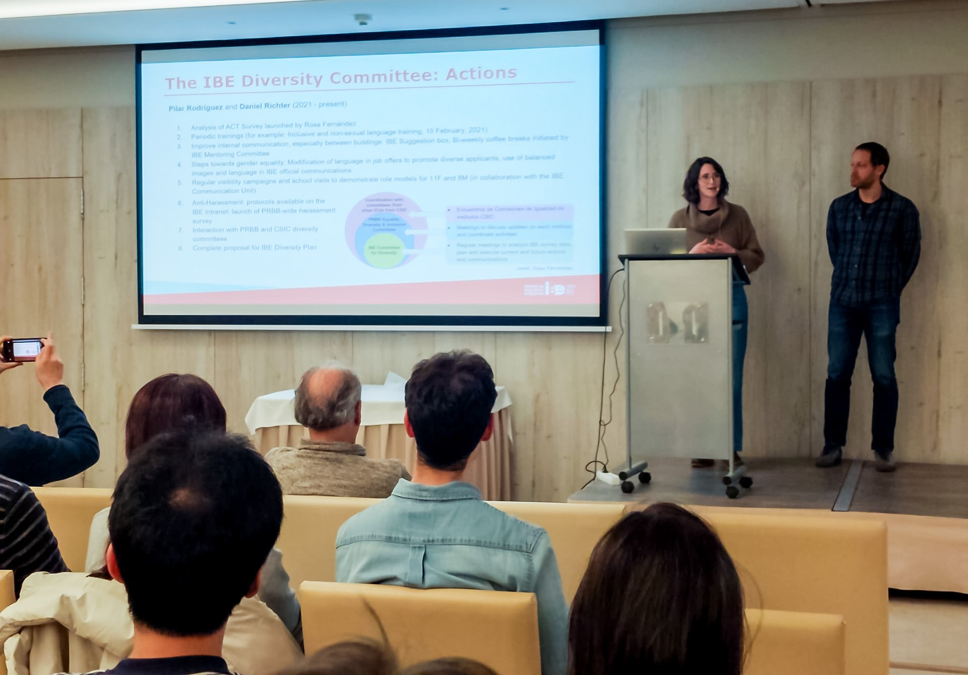 Los coordinadores del Comité de Diversidad del IBE, Pilar Rodriguez (responsable de comunicación y divulgación del IBE) y Daniel Richter (investigador principal), abordaron la brecha de género en la investigación y compartieron datos sobre la diversidad en la comunidad del IBE. Durante la sesión, se discutieron acciones clave incluidas en el nuevo Plan de Diversidad, diseñado para cerrar esta brecha, y se presentó la campaña en redes sociales Close The Scissors.