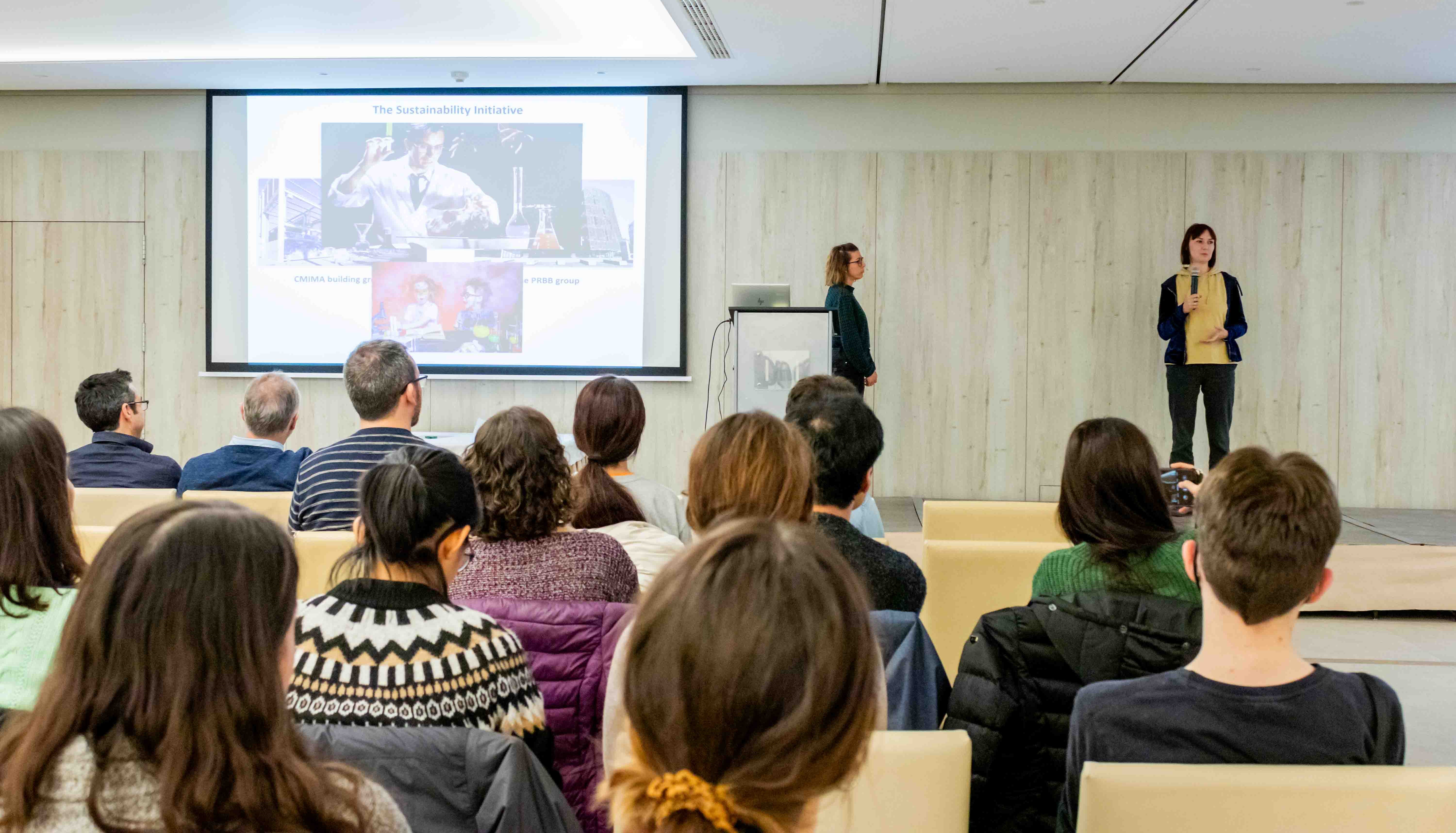 Las coordinadoras del Comité de Sostenibilidad del IBE, Judit Salces y Victoria Shabardina, presentaron las acciones recientes realizadas para mejorar la sostenibilidad del Instituto. Explicaron el impacto ambiental de las actividades de investigación y destacaron iniciativas como LabShare Barcelona, que fomenta la reutilización y el intercambio de recursos entre laboratorios, y Bring Your Own Cup, diseñada para reducir el uso de plásticos desechables en eventos y el día a día del instituto.