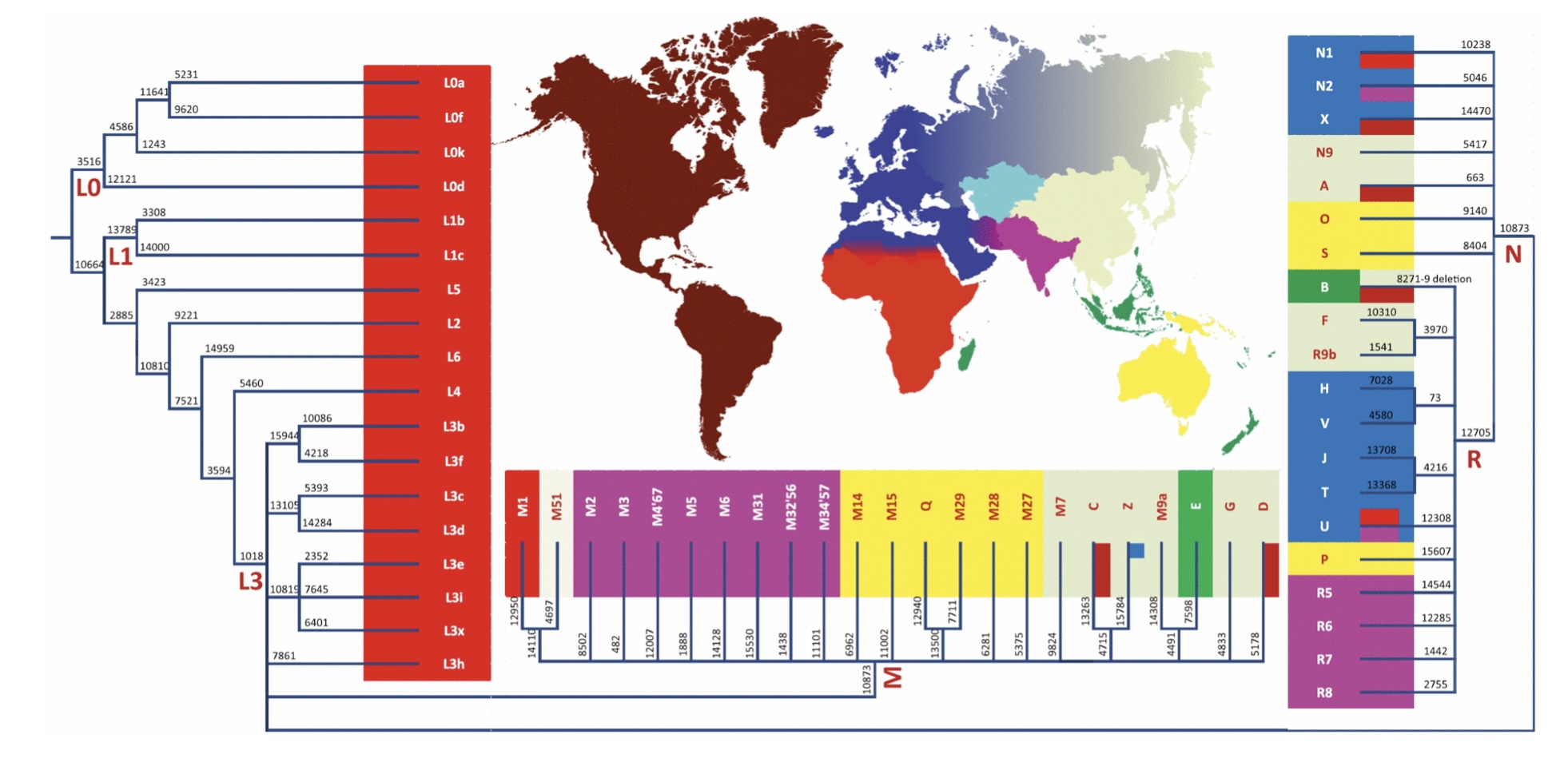 Distribución de haplogrupos que sirvieron como base para la construcción del IBE Mitotree (basado en el ADN mitocondrial de los miembros del IBE).
