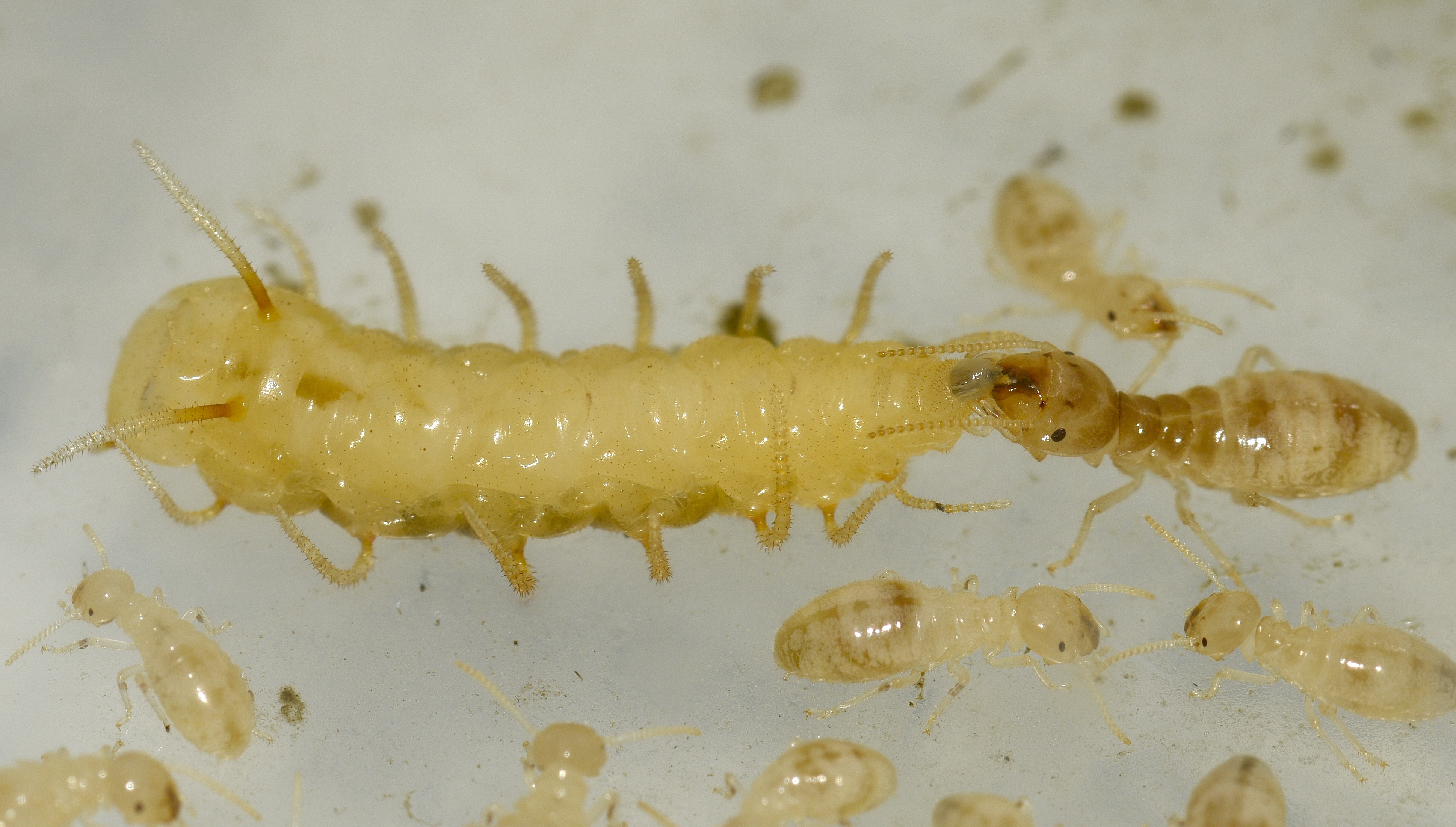 In the laboratory, possible mouth-to-mouth feeding (trophallaxis) is observed between harvester termites and blow fly larvae. Credit: Vlad Dinca.
