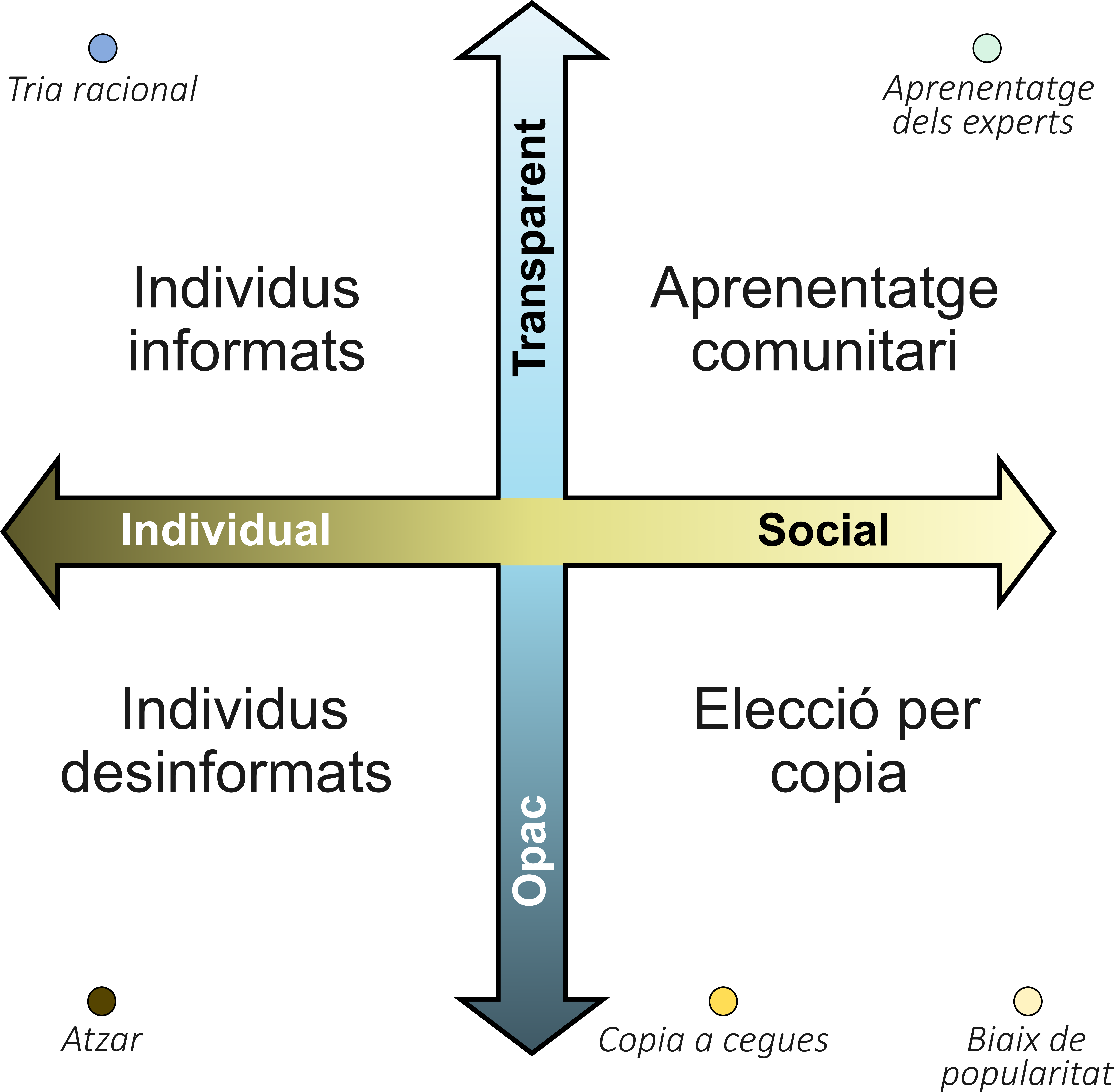 Quan la imitació és excessiva, però, es genera un biaix de popularitat que, sumat a la falta de transparència, pot arribar a aturar l’avenç del coneixement. En aquest escenari, els invents nous i beneficiosos topen amb l’anomenada “barrera d’utilitat”, la qual es genera perquè els individus no tenen un bon accés a la informació sobre els beneficis de l’invent, alhora que s’afavoreix la imitació de pràctiques que són de menor interès (o fins i tot, són perjudicials). són perjudicials).