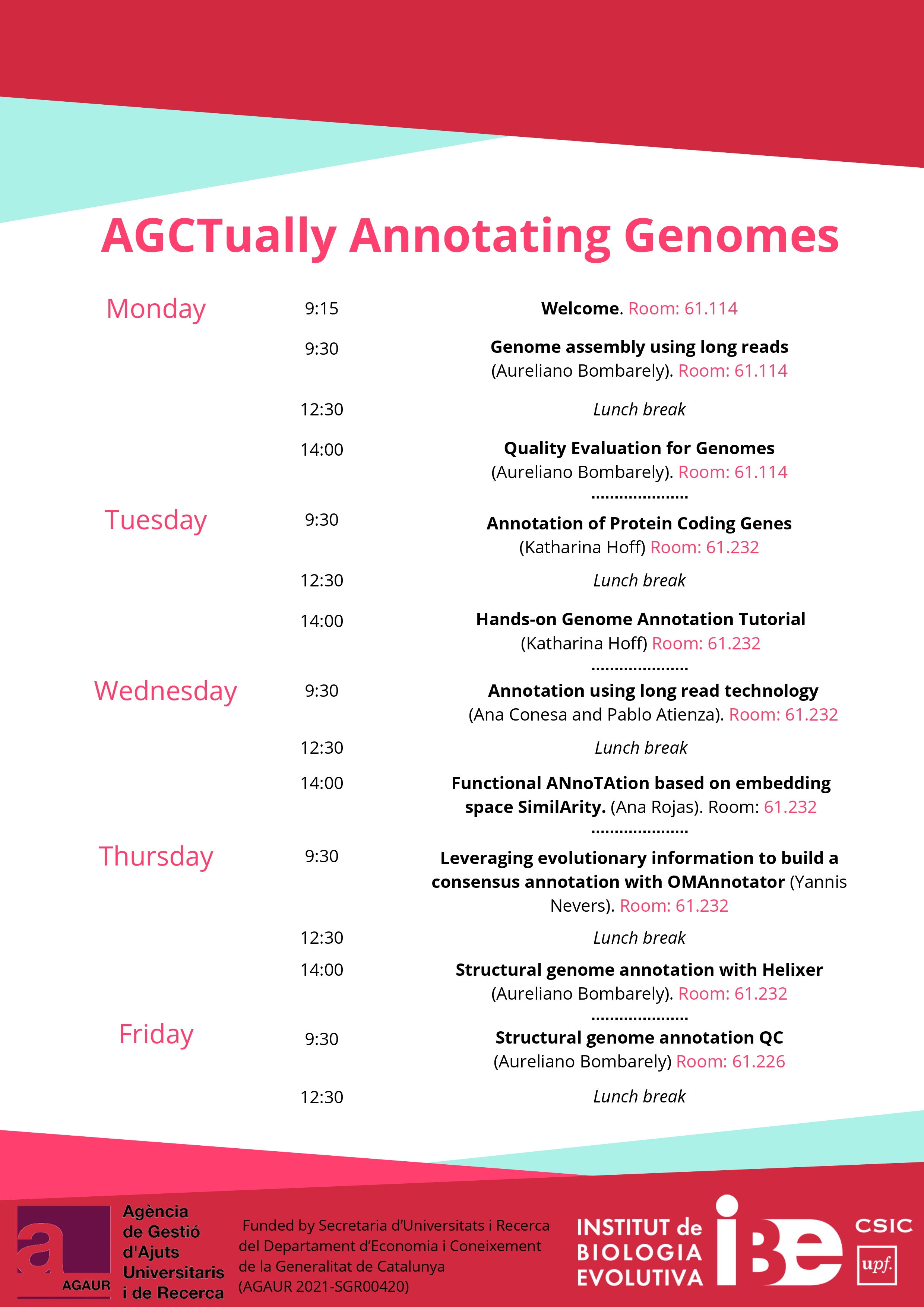 El programa compta amb la participació de reconeguts especialistes internacionals com Aureliano Bombarely, Katharina Hoff, Yannis Nevers, Ana Rojas, Pablo Atienza i Ana Conesa, que impartiran tallers i conferències sobre temàtiques capdavanteres en anotació genòmica: