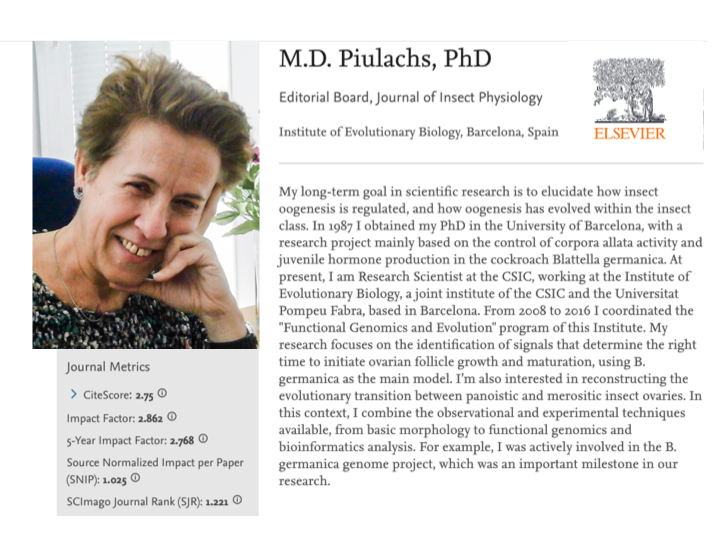 Maria Dolors Piulachs convidada a formar part del comitè editorial de "Journal of Insect Physiology"