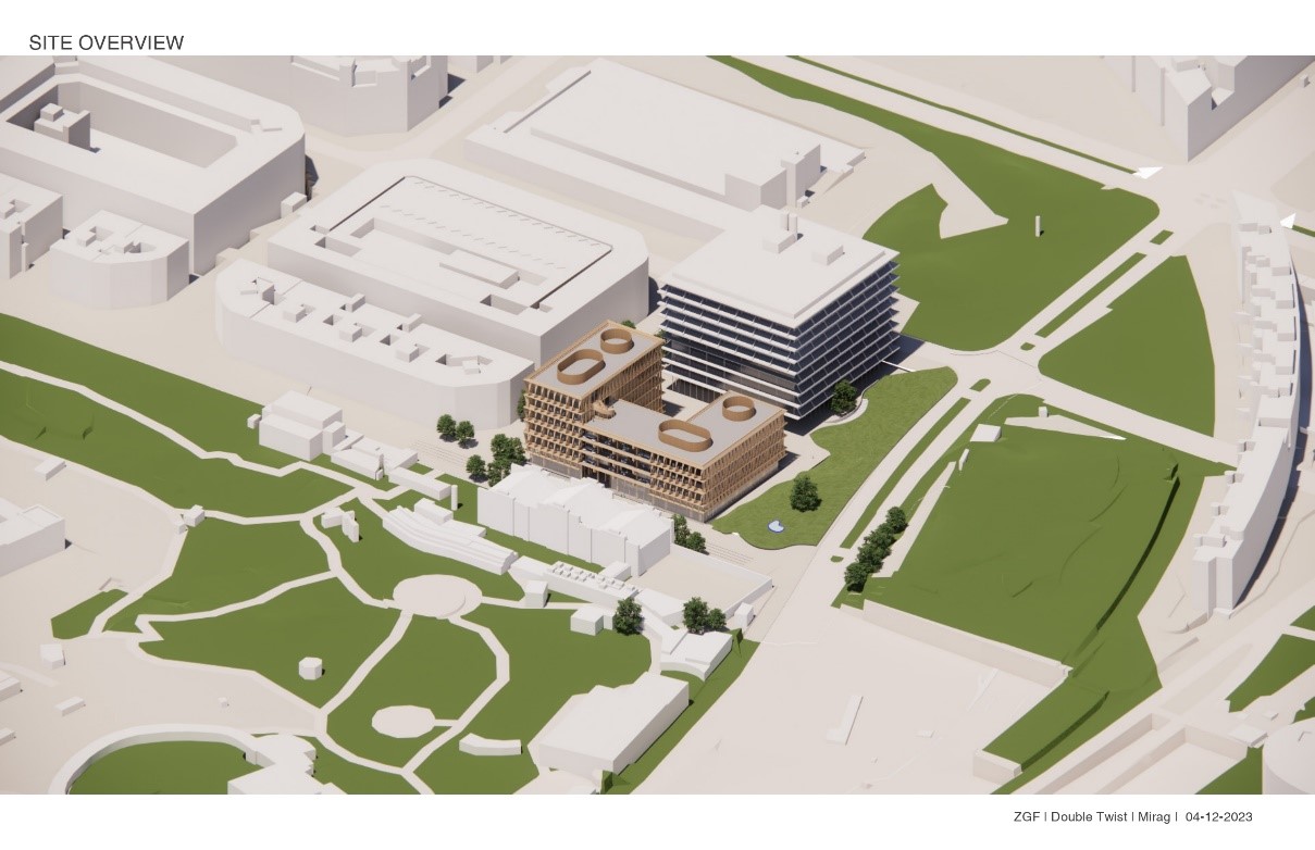 Visión oeste del edificio del IBE. Credito a ZFG, Double Twist y Mirag.