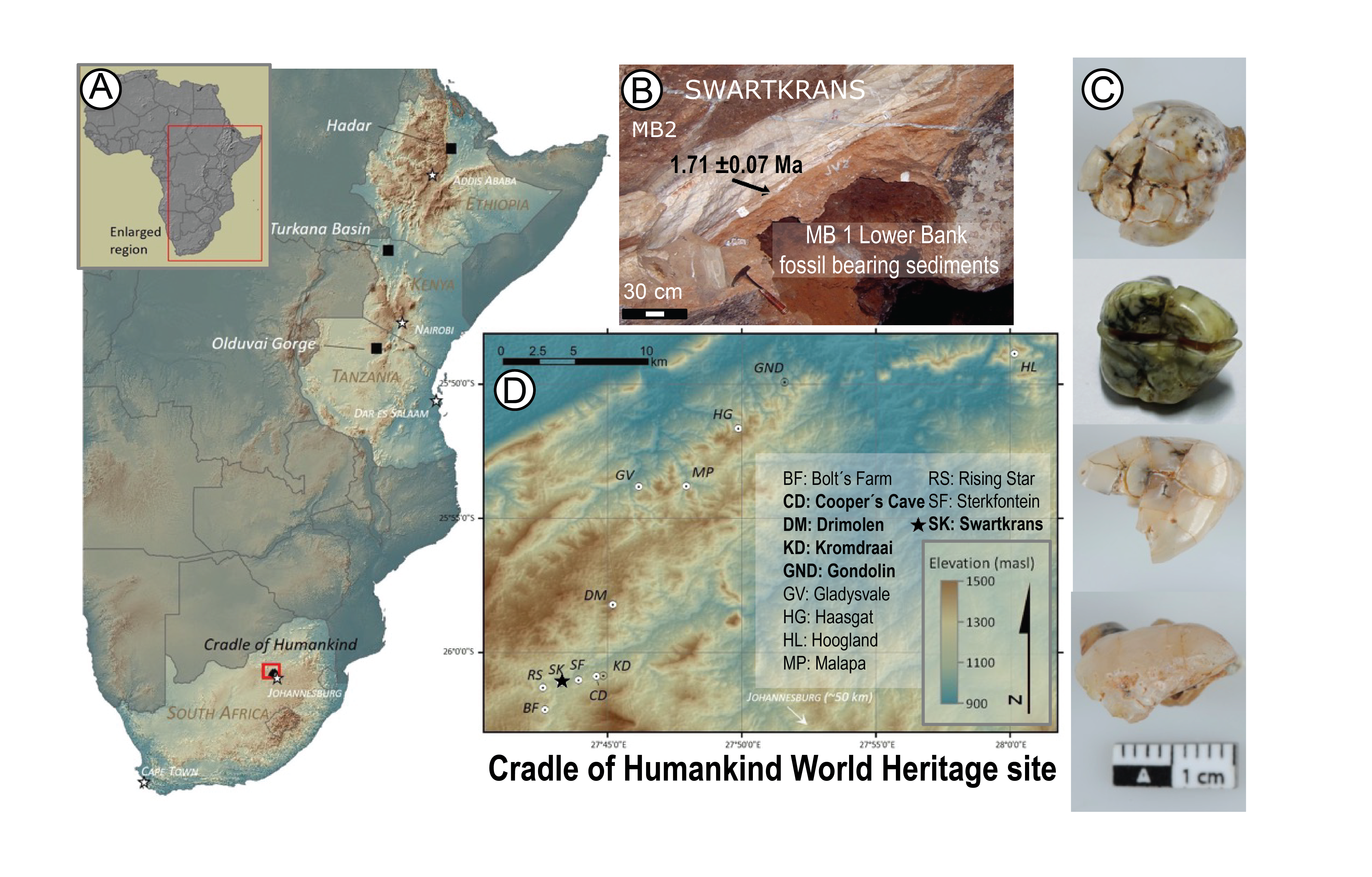 Ubicació i estructura de la cova del jaciment de Swartkrans, Sud-àfrica, i vista oclusal de les dents de Paranthropus analitzades, de dalt a baix: SK 830, un P4 esquerre; SK 835, un M3 esquerre; SK 850, un P3 dret; SK 14132. Crèdit: Dra. Robyn Pickering.